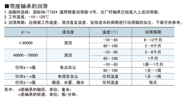油浴潤滑是普通的潤滑方法,適于低、中速帶座軸承的潤滑。方法是將帶座軸承一部分浸在由槽中,潤滑油由旋轉的帶座軸承零件帶起,然后又流回油槽油面應稍低于低滾動體的中心。滴油潤滑適于需要定量供應潤滑油得帶座軸承部件,滴油量一般每3-8秒一滴為宜,過多的油量將引起帶座軸承溫度增高。用油泵將過濾的油輸送到帶座軸承部件中,通過帶座軸承后的潤滑油再過濾冷卻后使用。由于循環油可帶走一定的熱量,使帶座軸承降溫,故此法適用于轉速較高的帶座軸承部件。用干燥的壓縮空氣經噴霧器與潤滑油混合形成油霧,噴射帶座軸承中,氣流可有效地使帶座軸承降溫并能防止雜質侵入。此法適于高速、高溫帶座軸承部件的潤滑。以上就是帶座軸承潤滑方法了。